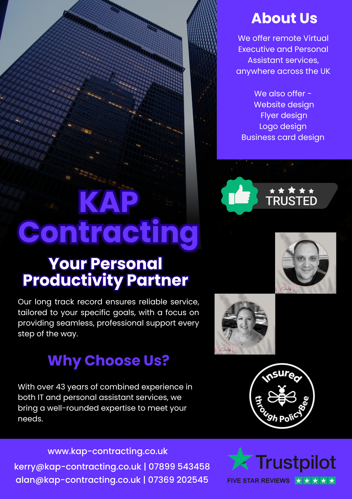 At KAP Contracting, we specialise in custom flyer design in the UK, creating promotional materials that attract attention and drive action. From bold, high-impact layouts to clean and modern designs, each flyer is crafted to suit your brand’s purpose and audience.